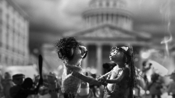 Une ourse qui raconte la longue histoire du mariage, de l’enfantement, de la place du couple dans notre Histoire, notre code civil, notre esprit. Émancipation des femmes, droit à l’avortement, mariage par amour et non plus par arrangement ou obligation, affirmation de l’homosexualité, refus de l’hypocrisie … sous la forme d’un conte, c’est la lente progression vers la modernité des libertés individuelles qui apparaît dans ce théâtre de marionnettes aux allures enfantines si fraîches et candides. Cela fait du bien, cela rassure, cela apaise, surtout quand on compare ces images si douces avec la violence des contestations conservatrices venues d’un âge révolu. Beaucoup de bruit pour rien, nous disent malicieusement ces peluches inoffensives, comme si ces hurlements n’étaient pas autre chose qu’un long cri d’agonie de croyances moribondes qui refusent l’oubli, pourtant inéluctable.